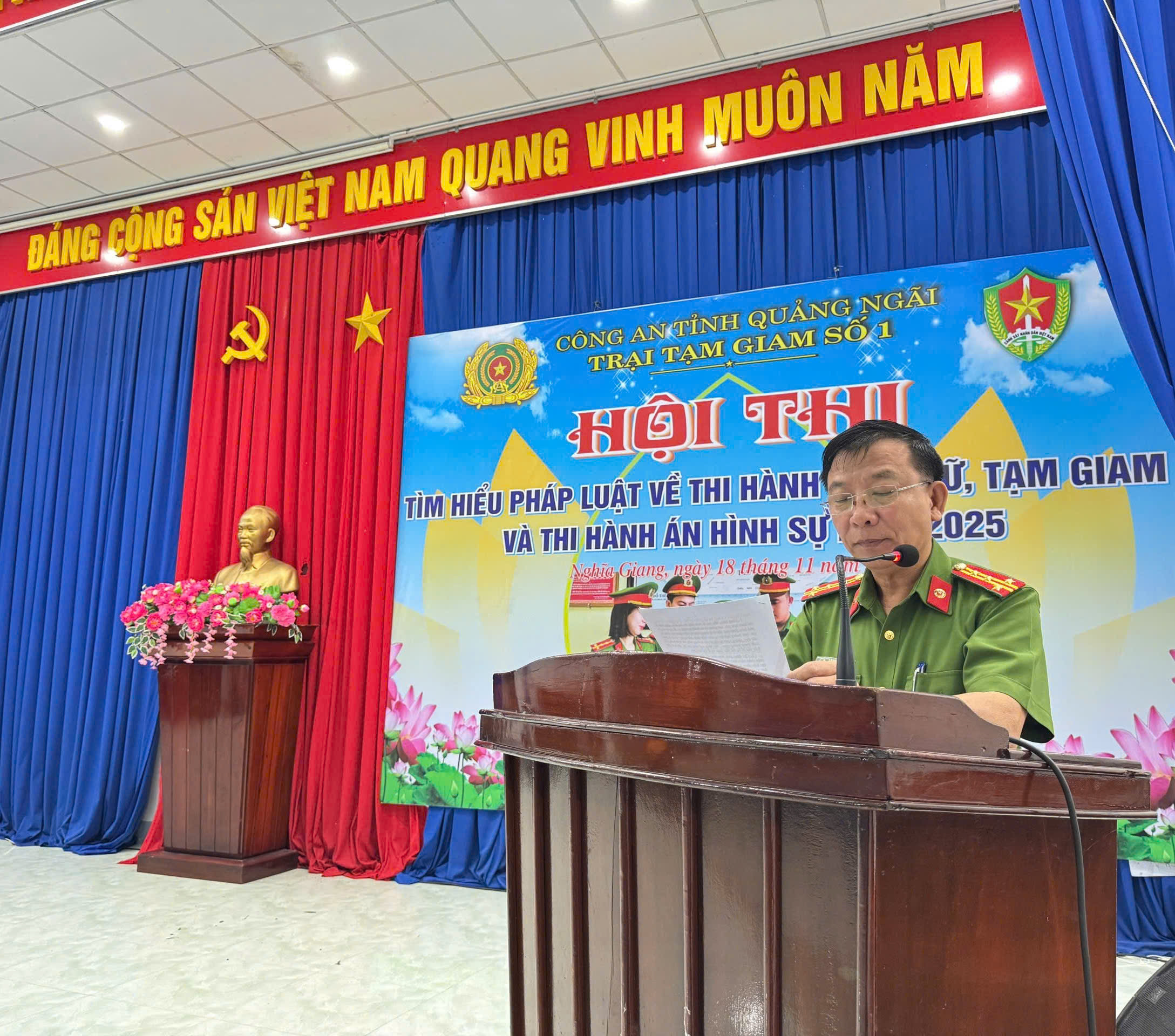 Ngày 18/11/2025, Trại Tạm giam số 1 Công an tỉnh Quảng Ngãi tổ chức Hội thi tìm hiểu pháp luật về tạm giữ, tạm giam và thi hành án hình sự năm 2025 với sự tham gia của 09 đội thi thuộc các đội và phân trại trực thuộc. Hội thi vinh dự có đồng chí Đại tá Lê Xuân Hưng – Phó Giám đốc Công an tỉnh đến dự và chỉ đạo.