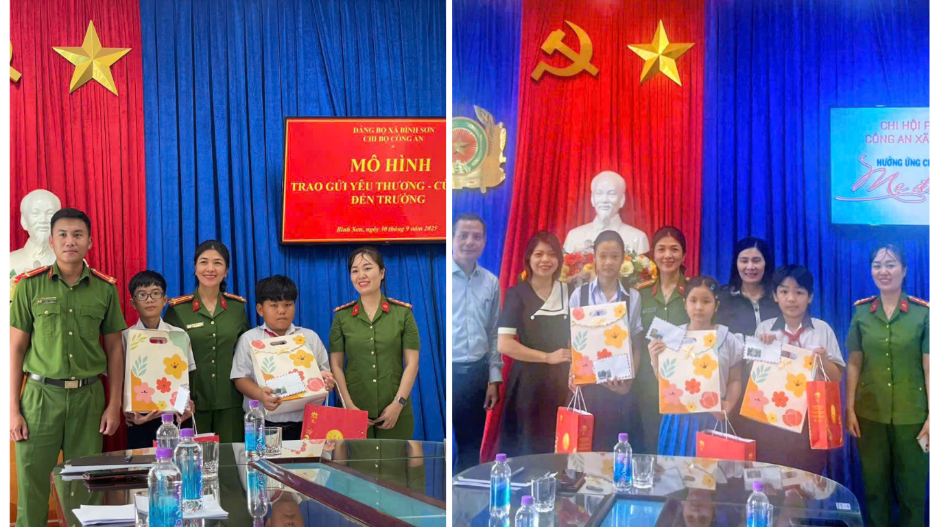 Nhằm tiếp tục đẩy mạnh thực hiện hiệu quả công tác “Dân vận khéo”, gắn với Chỉ thị số 05-CT/TW của Bộ Chính trị về học tập và làm theo tư tưởng, đạo đức, phong cách Hồ Chí Minh, đồng thời hưởng ứng Chương trình “Mẹ đỡ đầu” do Hội Liên hiệp Phụ nữ Việt Nam phát động; chiều ngày 30/9/2025, Chi bộ Công an xã Bình Sơn tổ chức Chương trình tiếp tục thực hiện mô hình “Trao gửi yêu thương - Cùng em đến trường”, gắn với Hội nghị Phụ nữ và Lễ ra mắt Chương trình “Mẹ đỡ đầu” do Chi hội Phụ nữ Công an xã tham mưu thực hiện.