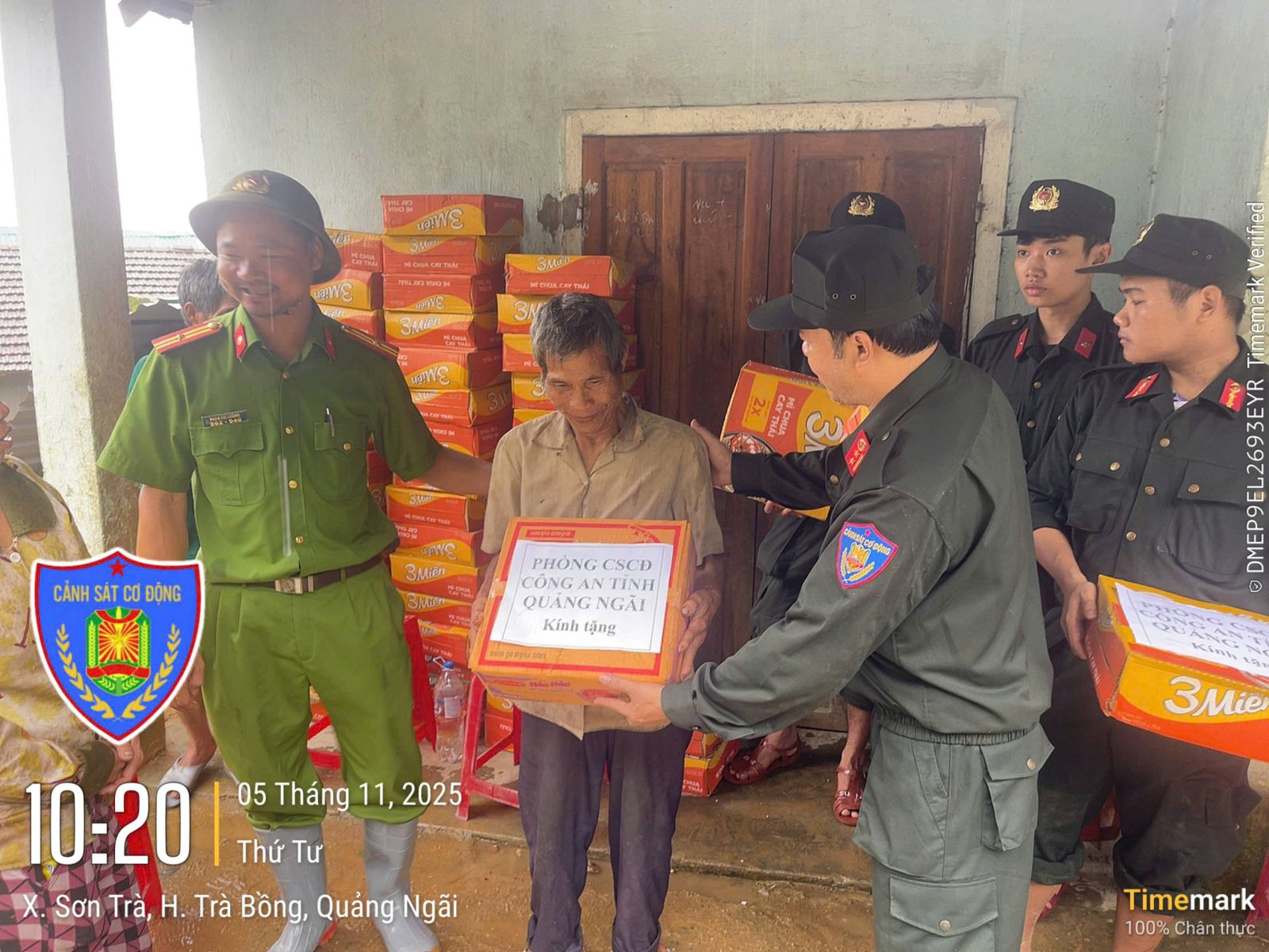 Không dừng lại ở đó, đoàn công tác Phòng Cảnh sát cơ động còn phối hợp cùng Công an xã Sơn Trà đến thăm hỏi, trao tặng nhiều suất quà gồm mì tôm, nhu yếu phẩm thiết yếu cho các hộ dân có hoàn cảnh khó khăn, bị ảnh hưởng nặng nề bởi thiên tai. Những phần quà nhỏ nhưng chứa đựng nghĩa tình, thể hiện tấm lòng nhân ái của lực lượng Công an nhân dân đối với đồng bào vùng cao.