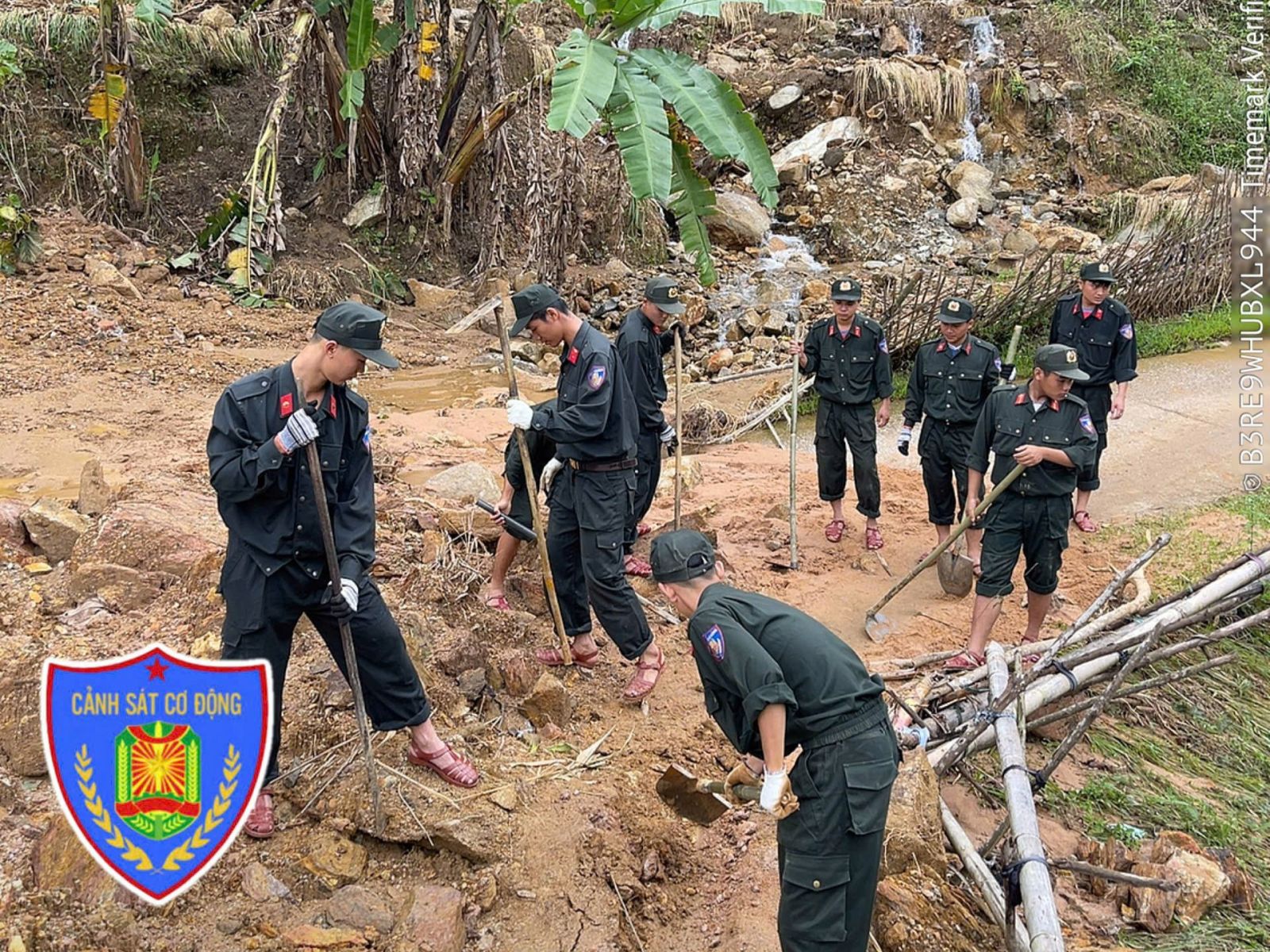 Sáng ngày 5/11/2025, tại xã Sơn Trà, hàng chục cán bộ, chiến sĩ Phòng Cảnh sát cơ động Công an tỉnh Quảng Ngãi đã vượt đường rừng, có mặt tại khu vực bị sạt lở để cùng người dân san gạt bùn đất, khơi thông cống rãnh, gia cố taluy và dọn dẹp cây cối, đá sạt xuống đường. Trong điều kiện thời tiết xấu, mưa rừng kéo dài, các anh vẫn kiên trì bám trụ, làm việc không ngừng nghỉ với tinh thần “nước rút đến đâu, dân đi lại được đến đó”.