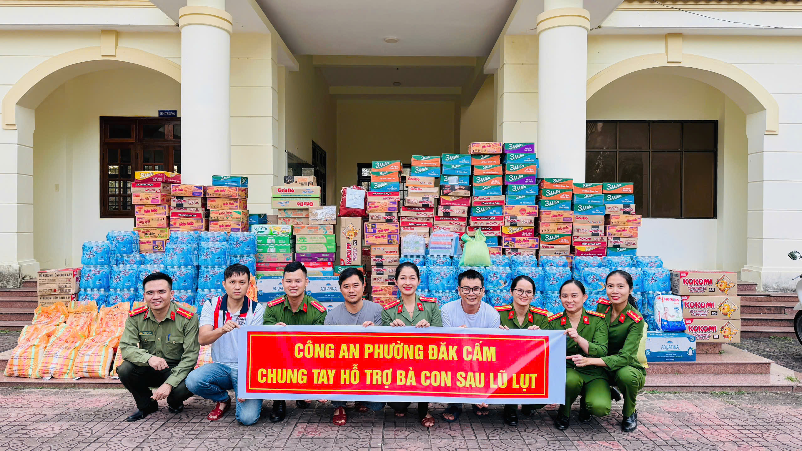 Tập thể cán bộ, chiến sĩ Công an phường đã cùng chung tay đóng góp các nhu yếu phẩm gồm: 4800 vở học sinh, 290 kg gạo, 168 thùng mì tôm, 200 thùng nước uống, 60 thùng sữa trẻ em, chăn mền, thuốc men, quần áo và một số vật dụng thiết yếu khác. Bên canh đó, Công an Phường Đăk Cấm còn phối hợp với các đơn vị trong địa bàn phường vận động bà con Nhân dân cùng chung tay hỗ trợ, chia sẻ cho người dân đang gặp khó khăn vùng lũ lụt.