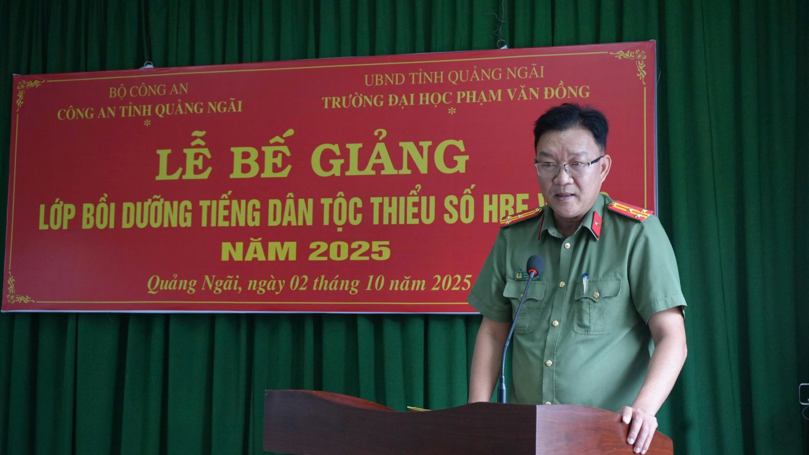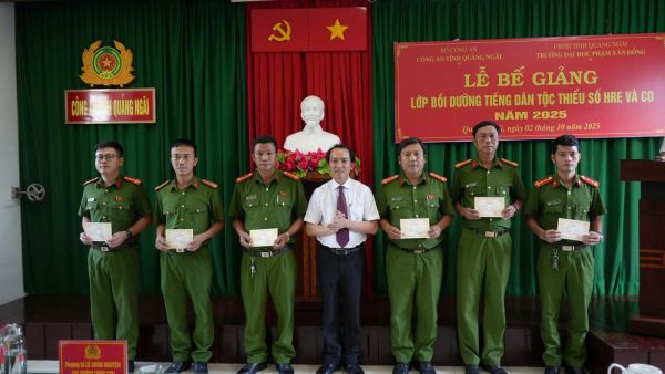 Ngày 02/10/2025, tại Trung tâm Huấn luyện và Bồi dưỡng nghiệp vụ, Công an tỉnh Quảng Ngãi phối hợp với Trường Đại học Phạm Văn Đồng tổ chức bế giảng lớp bồi dưỡng tiếng dân tộc thiểu số Hre và Co năm 2025. Đồng chí Thượng tá Lê Xuân Nguyên - Phó Trưởng Phòng Tổ chức cán bộ, Công an tỉnh và Tiến sĩ Trần Đình Thám - Hiệu trưởng Trường Đại học Phạm Văn Đồng đồng chủ trì buổi lễ.
