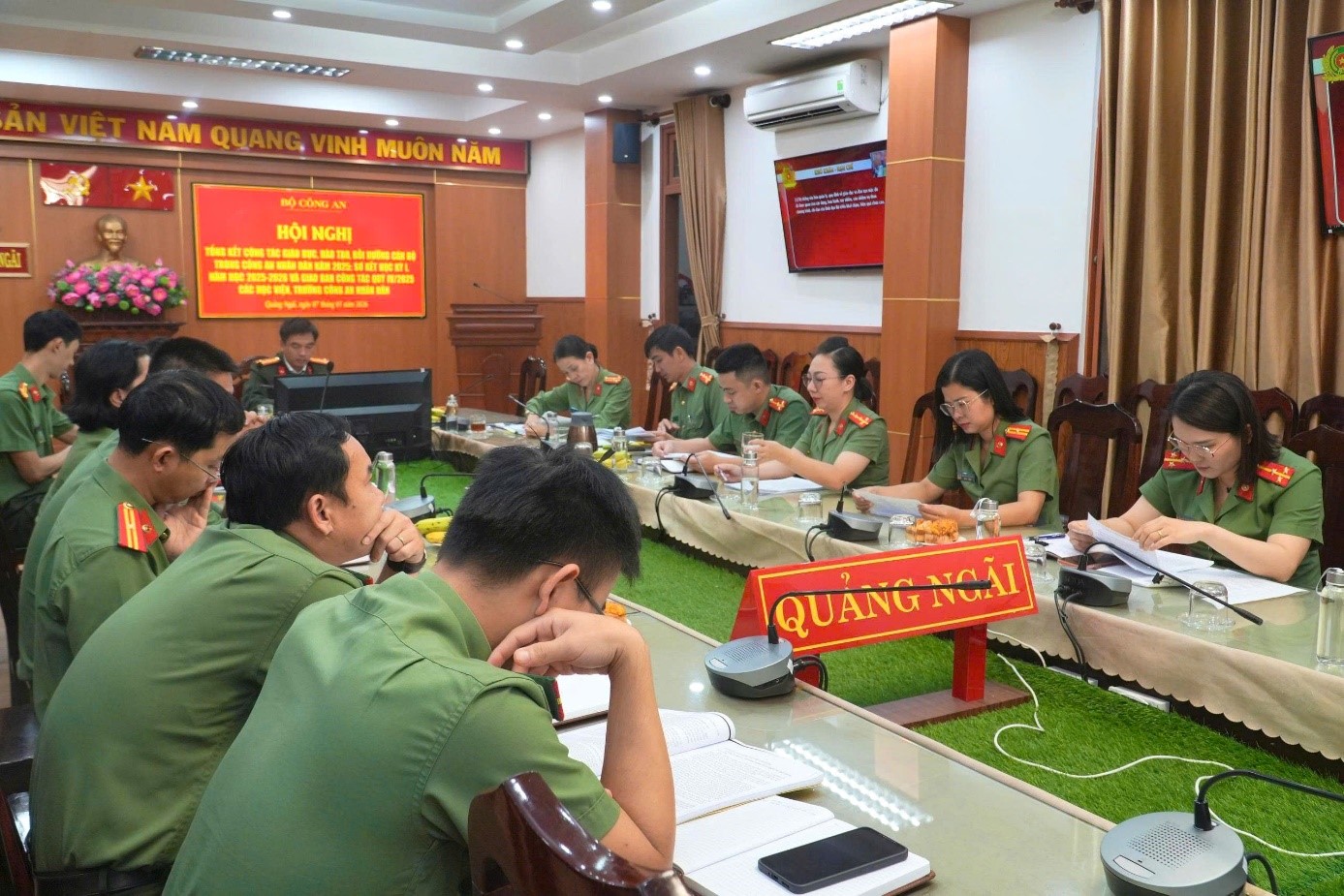 Thừa lệnh Giám đốc Công an tỉnh, tại điểm cầu Công an tỉnh Quảng Ngãi, đồng chí Thượng tá Đinh Văn Bình, Ủy viên Ban Chấp hành Đảng bộ Công an tỉnh, Bí thư Đảng ủy, Trưởng phòng Tổ chức cán bộ chủ trì, cùng đại diện lãnh đạo một số phòng chức năng và cán bộ, chiến sĩ các đơn vị liên quan tham dự Hội nghị.