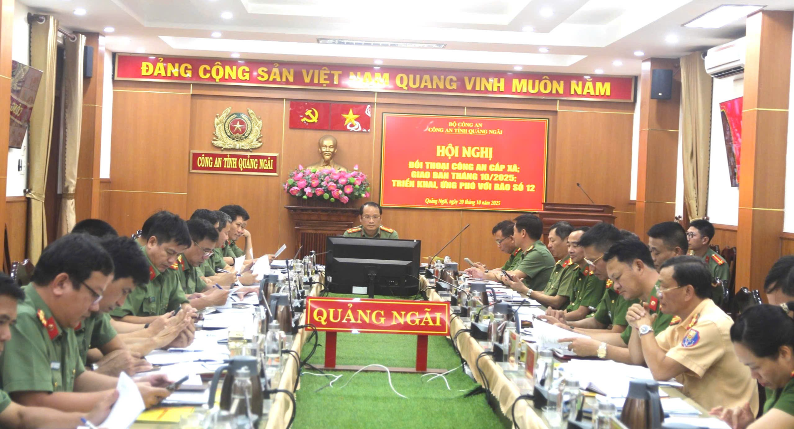 Ngày 20/10/2025, Giám đốc Công an tỉnh tổ chức Hội nghị đối thoại với Công an cấp xã; Giao ban Công an tỉnh tháng 10/2025 và triển khai, ứng phó với bão số 12. Đồng chí Đại tá Hồ Song Ân, Giám đốc Công an tỉnh chủ trì Hội nghị. Tham dự Hội nghị có các đồng chí Phó Giám đốc Công an tỉnh, Trưởng Công an các đơn vị, địa phương. Hội nghị tổ chức trực tiếp và trực tuyến đến các điểm cầu Công an cấp xã.