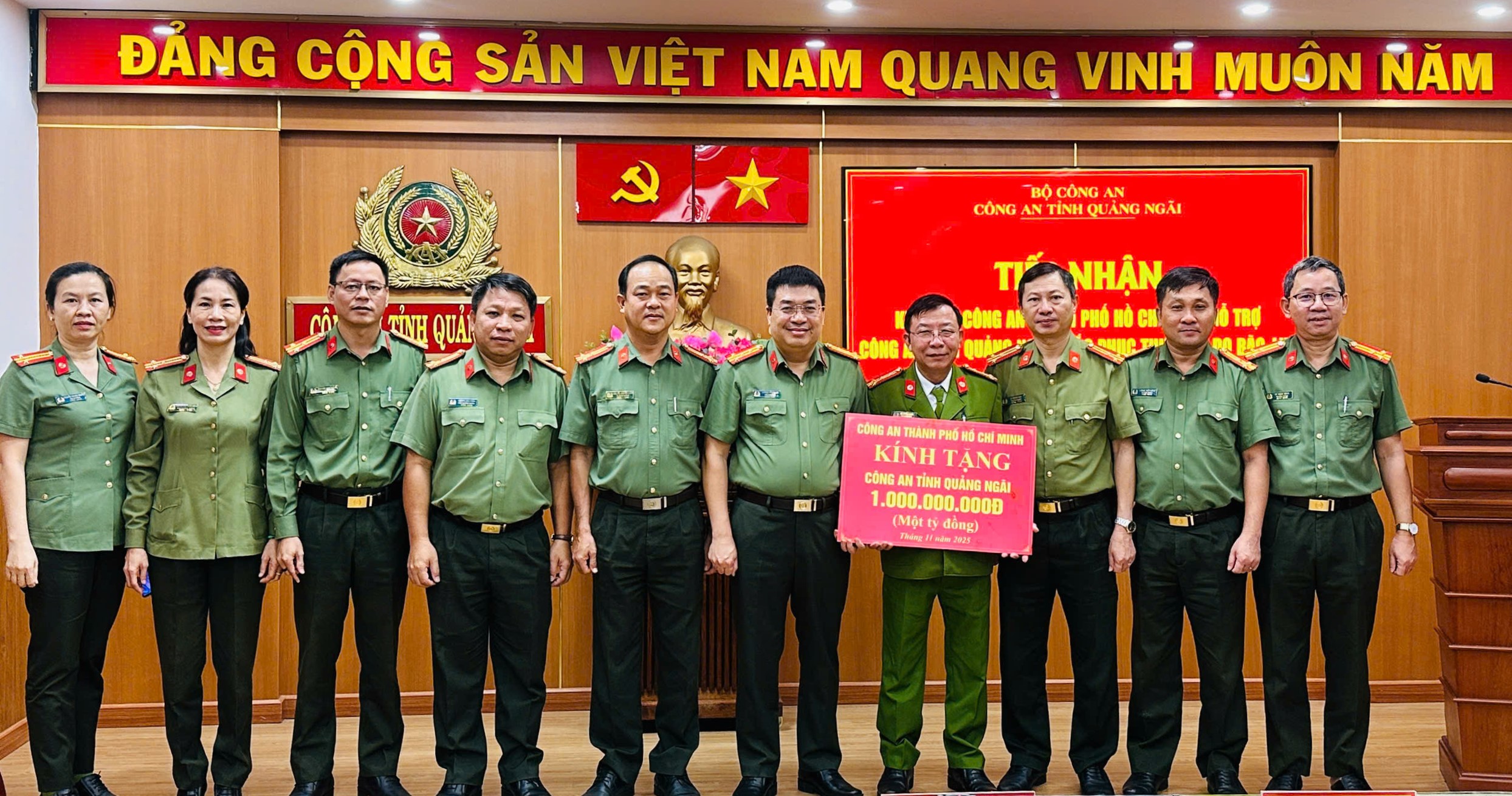 Sáng 28/11/2025, đoàn công tác Công an Tp. Hồ Chí Minh do Đại tá Lương Đức Minh, Phó Giám đốc Công an TP Hồ Chí Minh làm Trưởng đoàn đã đến thăm, động viên và trao 1 tỷ đồng hỗ trợ Công an tỉnh Quảng Ngãi và Nhân dân địa phương khắc phục thiệt hại nặng nề do mưa lũ gây ra.