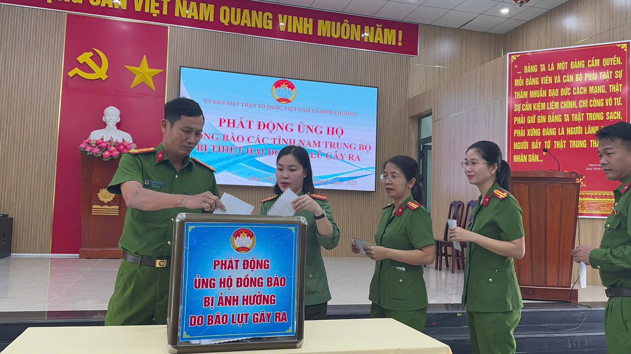 Hưởng ứng lời kêu gọi đầy ý nghĩa này, Công an xã Bình Chương đã nhanh chóng triển khai hoạt động ủng hộ trong toàn đơn vị. Với tinh thần tương thân tương ái, mỗi cán bộ, chiến sĩ đã tự nguyện đóng góp kinh phí trực tiếp tại buổi phát động. Hoạt động diễn ra trang trọng, thể hiện rõ tình cảm, trách nhiệm và sự sẻ chia của lực lượng Công an xã đối với những hộ dân đang oằn mình chống chọi với thiên tai.