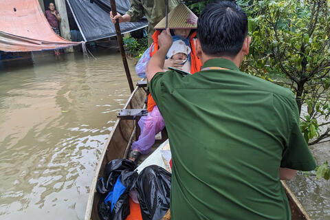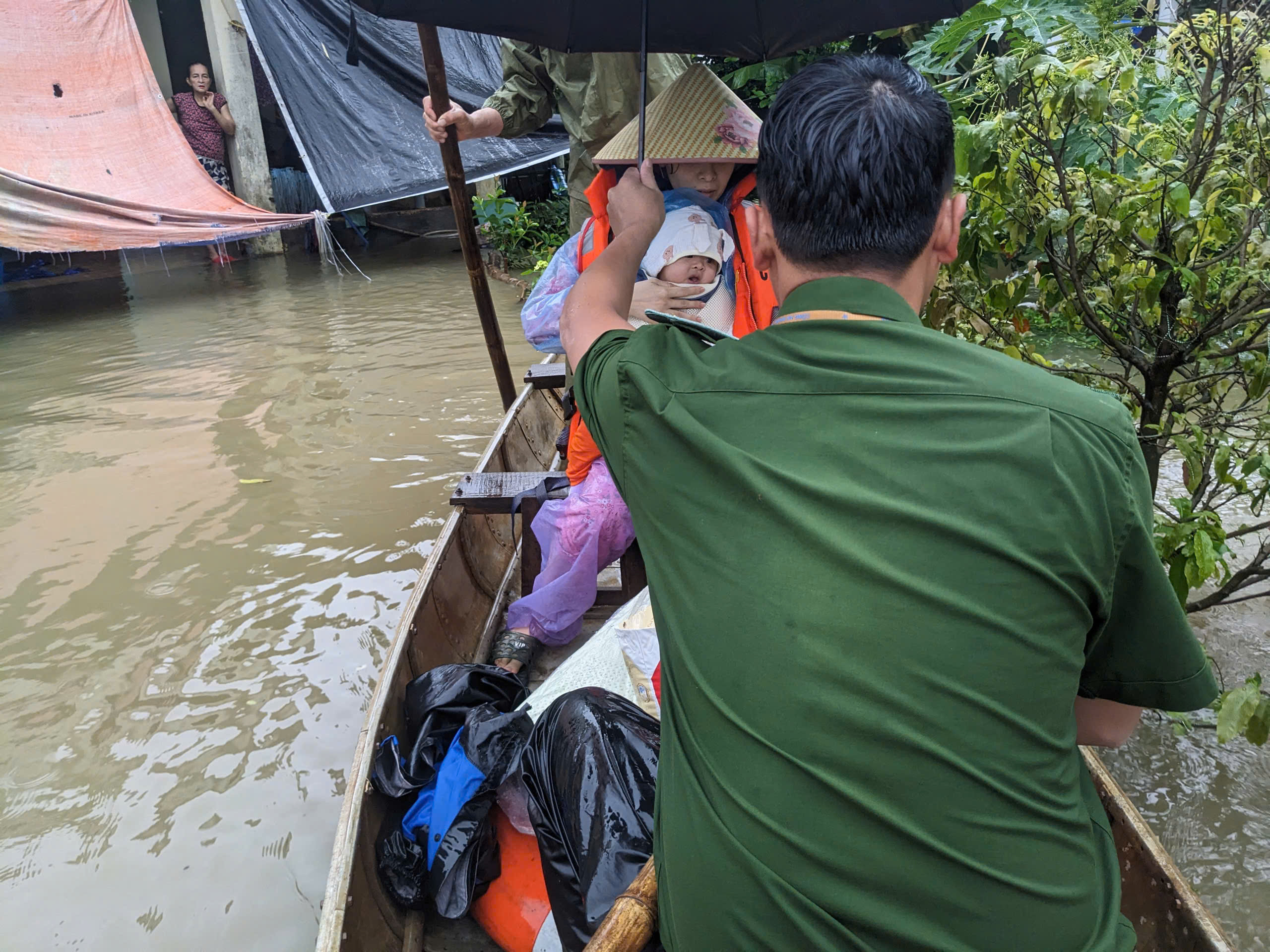 Bất chấp thời tiết mưa lớn, nước chảy xiết, cán bộ, chiến sĩ Công an xã đã dùng ghe vượt qua vùng ngập sâu để tiếp cận hiện trường, hỗ trợ đưa sản phụ cùng cháu bé sơ sinh ra khỏi khu vực nguy hiểm. Cảm động hơn, trong quá trình cứu hộ, một cán bộ Công an xã đã nhường áo phao của mình cho sản phụ, đảm bảo an toàn tuyệt đối cho hai mẹ con.