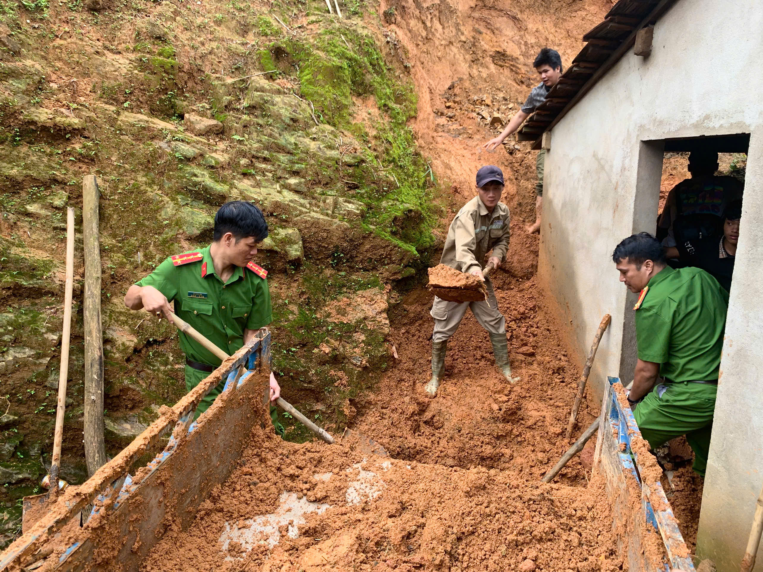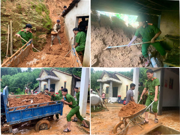 Trong quá trình làm việc, cán bộ, chiến sĩ không ngại mưa gió, bùn lầy, cùng bà con xúc đất, bê đá, vận chuyển từng khối đất sạt lở, thể hiện tinh thần trách nhiệm và tấm lòng tận tụy “Vì Nhân dân phục vụ”.