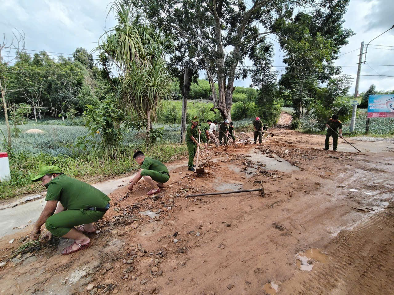 Công an xã Trà Giang khắc phục sạt lở, đảm bảo an toàn giao thông sau mưa lớn