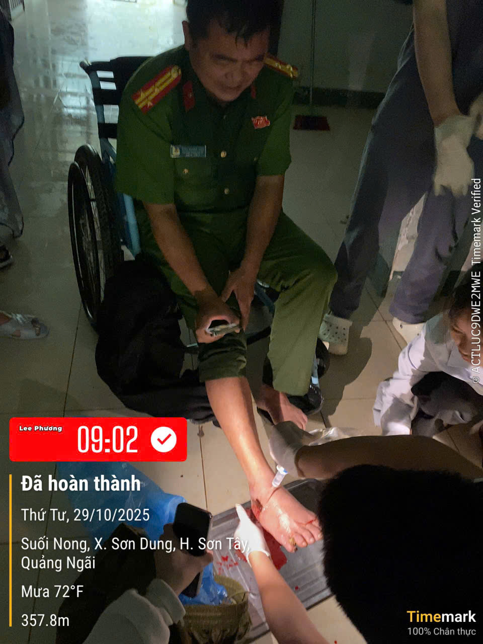 Trong quá trình thực hiện nhiệm vụ, đồng chí Thượng tá Đinh Quang Tiến – Trưởng Công an xã Sơn Tây trực tiếp có mặt tại hiện trường, chỉ huy lực lượng giúp dân di dời tại các nơi có nguy cơ sạt lở cao. Khi đang cùng đồng đội hỗ trợ một hộ dân gia cố lại mái nhà, do nước lũ dâng nhanh, dòng chảy mạnh đã làm sập mái và vách tường. Một thanh gỗ lớn bất ngờ đâm xuyên bàn chân phải khiến đồng chí Tiến bị thương.