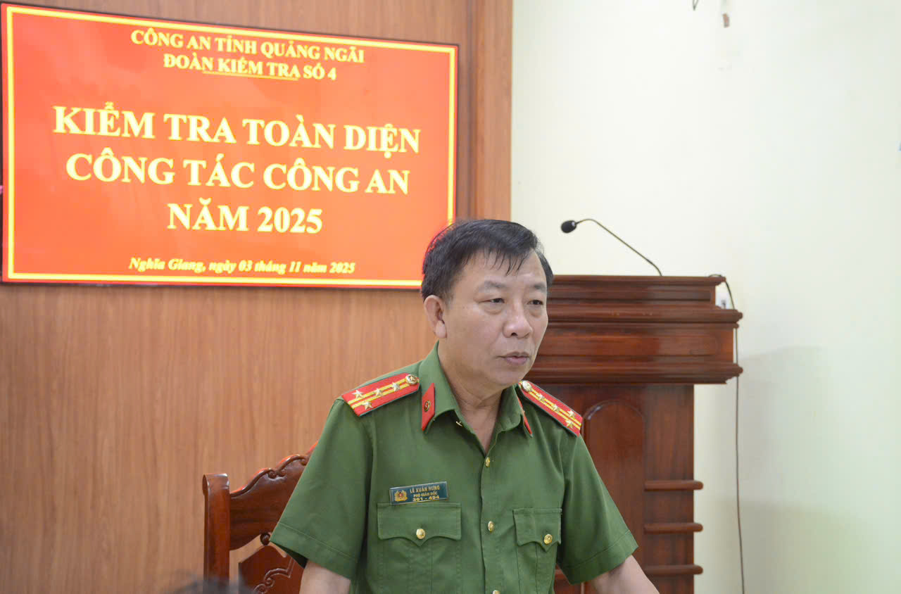 Thực hiện chương trình, kế hoạch công tác năm 2025, sáng ngày 03/11/2025, Đoàn kiểm tra số 4 của Công an tỉnh Quảng Ngãi do Đại tá Lê Xuân Hưng – Phó Giám đốc Công an tỉnh làm Trưởng đoàn đã đến làm việc và tiến hành kiểm tra toàn diện công tác công an tại Trại tạm giam cơ sở 1 Công an tỉnh.