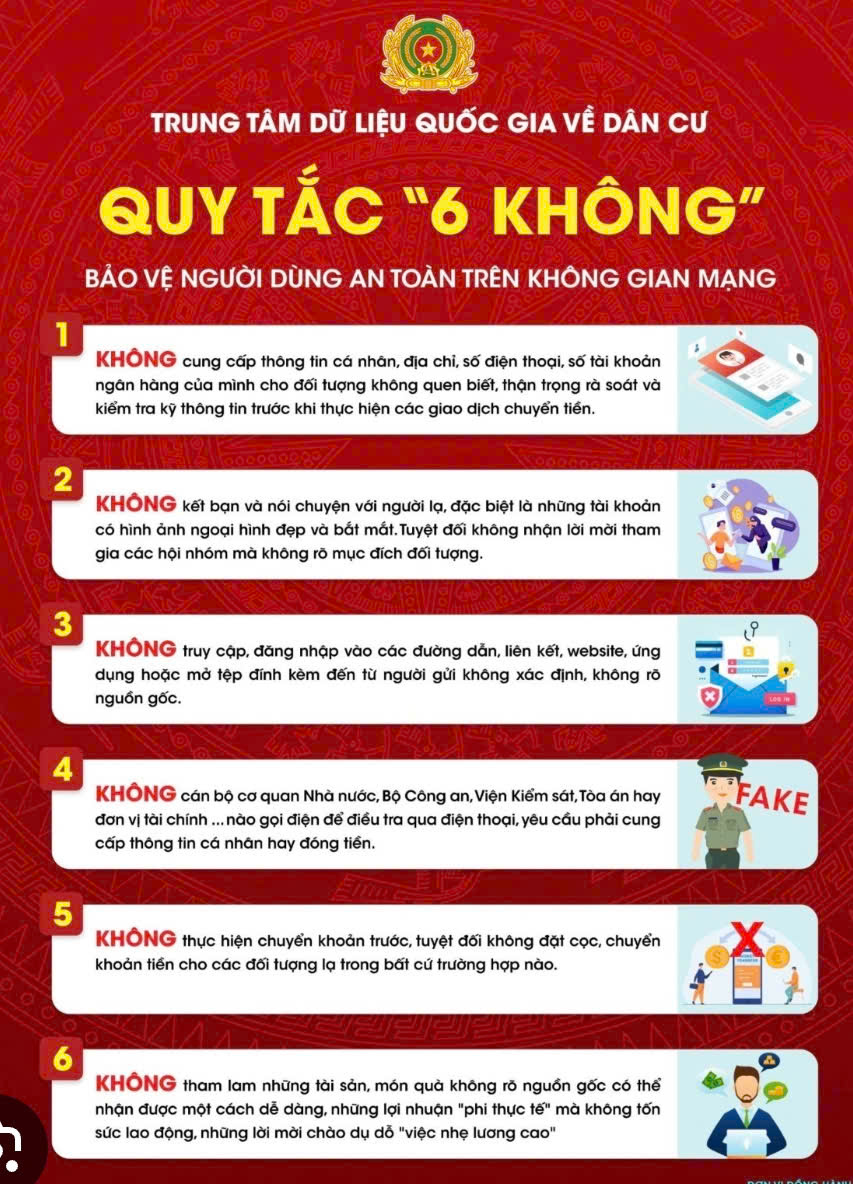 1. KHÔNG cung cấp thông tin cá nhân, địa chỉ, số điện thoại, số tài khoản ngân hàng của mình cho đối tượng không quen biết, thận trọng rà soát và kiểm tra kỹ thông tin trước khi thực hiện các giao dịch chuyển tiền.