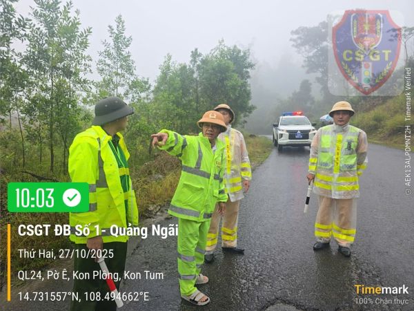 Do ảnh hưởng của mưa lớn kéo dài, trên tuyến Quốc lộ 24C, đoạn qua các Km 72, 76 và 80 thuộc địa phận xã Thanh Bồng, tỉnh Quảng Ngãi đã xảy ra nhiều điểm sạt lở đất nghiêm trọng, gây ách tắc giao thông trên toàn tuyến. Suốt đêm ngày 26 và sang ngày 27-10, Công an xã Thanh Bồng và Công an xã Đông Trà Bồng đã nhanh chóng tổ chức lực lượng chốt chặn, hướng dẫn và đảm bảo an toàn giao thông tại các khu vực nguy hiểm; huy động phương tiện cơ giới xe máy đào, máy ủi tập trung san ủi, dọn dẹp khối lượng đất đá sạt lở để khắc phục, thông tuyến. Đại úy Phan Nguyễn Anh Bảo cho biết: “Công an xã đã chủ động phân công lực lượng tuần tra, rà soát tại các điểm xung yếu, để kịp thời phát hiện các khu vực nguy hiểm, tổ chức lực lượng lập chốt, căng dây cảnh báo, phân luồng giao thông và hướng dẫn người dân không đi qua lại những khu vực nguy hiểm, đồng thời khuyến cáo người dân tuyệt đối không di chuyển, qua lại các khu vực tràn nước để bảo đảm an toàn tính mạng và tài sản”.