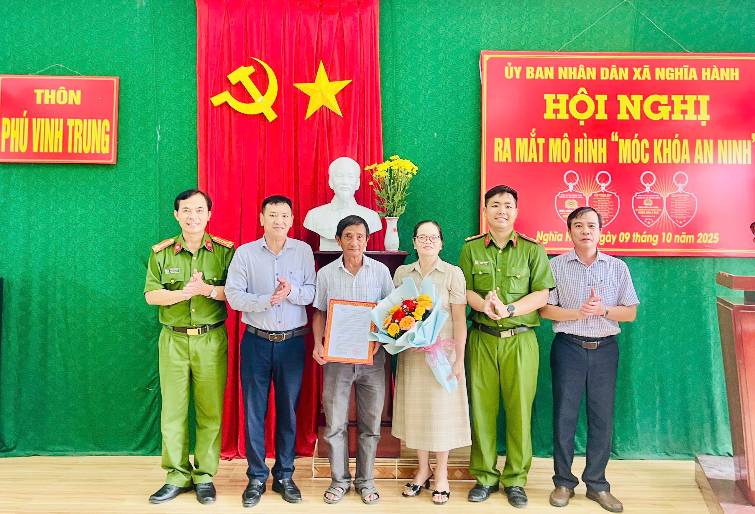 Chiều ngày 09/10/2025, tại Nhà Văn hóa thôn Phú Vinh Trung, Công an xã đã phối hợp với Ban thôn Phú Vinh Trung tham mưu Ủy ban nhân dân xã Nghĩa Hành tổ chức Hội nghị ra mắt mô hình “Móc khóa an ninh” tại thôn Phú Vinh Trung, xã Nghĩa Hành. Đến dự Hội nghị có đồng chí Nguyễn Ngọc Tuấn - Phó Bí thư Đảng ủy, Chủ tịch UBND xã; đồng chí Lê Quang Nhu - Ủy viên Ban Thường vụ Đảng ủy, Chủ tịch UBMTTQ Việt Nam xã; đồng chí Thượng tá Trần Văn Hảo, Ủy viên Ban Thường vụ Đảng ủy, Bí thư Chi bộ, Trưởng Công an xã; Lãnh đạo Công an xã phụ trách Tổ Cảnh sát khu vực; Đại diện lãnh đạo Ban chỉ huy Quân sự xã; Văn phòng HĐND và UBND xã, các phòng, ban, ngành, đại diện lãnh đạo Ngân hàng Nông nghiệp và Phát triển nông thôn (Agribank) Nghĩa Hành; Trưởng các thôn trên địa bàn; Tổ trưởng Tổ bảo vệ ANTT các thôn trên địa bàn xã và đông đảo Nhân dân thôn Phú Vinh Trung.