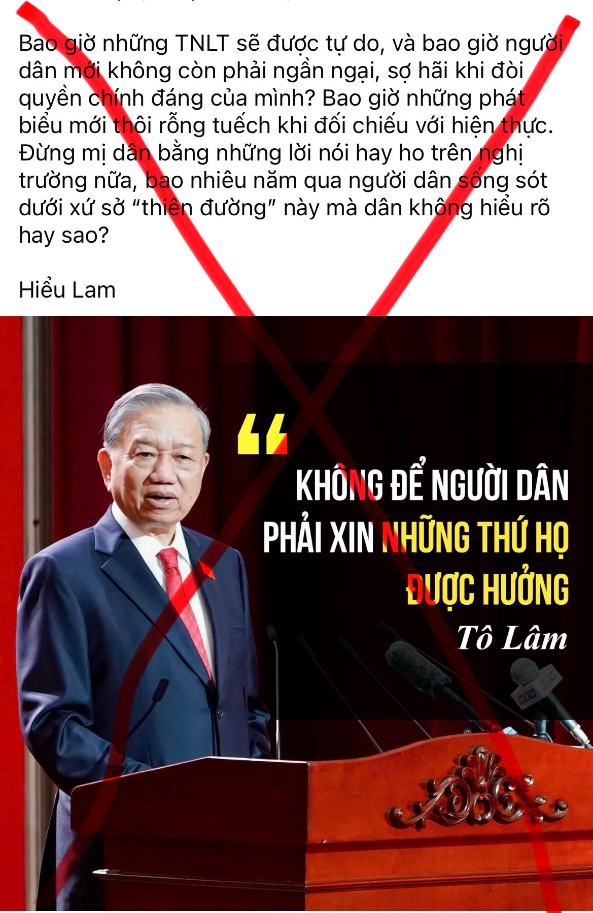 Bài viết trên trang của tổ chức Việt Tân đã cố tình cắt xén ngữ cảnh và bóp méo ý nghĩa phát biểu của Tổng Bí thư Tô Lâm về việc xây dựng Nhà nước pháp quyền, biến một chủ trương vì dân thành luận điệu tấn công chính quyền, nhằm mục đích gây hoang mang dư luận và chống phá Nhà nước.