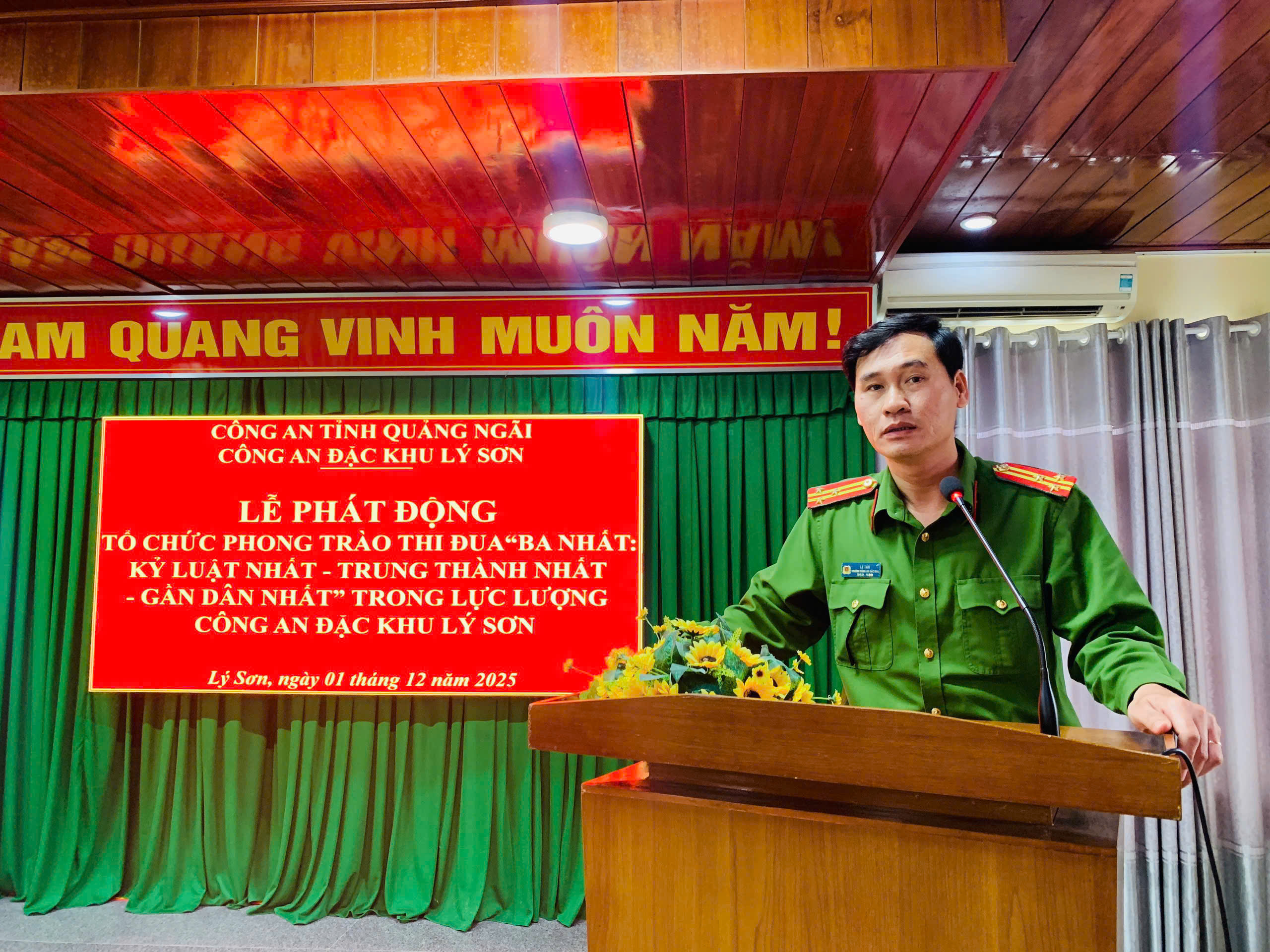 Sáng 01/12/2025, Công an đặc khu Lý Sơn tổ chức Lễ phát động phong trào thi đua “Ba nhất: Kỷ luật nhất - Trung thành nhất - Gần dân nhất”. Thượng tá Lê Tấn, Trưởng Công an đặc khu chủ trì; tham dự có Ban Chỉ huy và toàn thể cán bộ, chiến sĩ.
