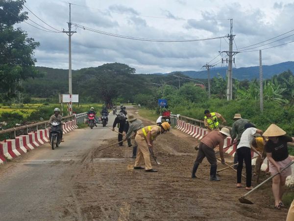 Ngay lập tức, các cán bộ, chiến sĩ Cảnh sát giao thông đã chủ động phối hợp cùng người dân địa phương tiến hành dọn dẹp, thu gom đất đá, bùn đất, đảm bảo lưu thông an toàn. Được sự huy động của lực lượng CSGT, người dân ven đường cũng tích cực mang theo xẻng, chổi, bao tải cùng chung tay hỗ trợ.
