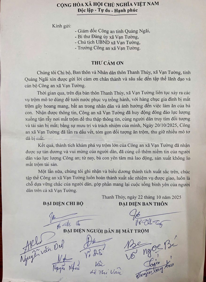 Trong thời gian qua, tại thôn Thanh Thủy, xã Vạn Tường, tỉnh Quảng Ngãi liên tiếp xảy ra nhiều vụ trộm cắp máy mô tơ bơm nước phục vụ sản xuất hành tím, gây thiệt hại lớn về tài sản và khiến người dân hết sức hoang mang, lo lắng. Trước tình hình đó, Công an xã Vạn Tường đã nhanh chóng vào cuộc, triển khai đồng bộ các biện pháp nghiệp vụ, điều tra, truy xét, làm rõ và bắt giữ đối tượng gây án, thu hồi gần 100 triệu đồng tài sản bị trộm cắp, được Nhân dân gửi thư cảm ơn, biểu dương.