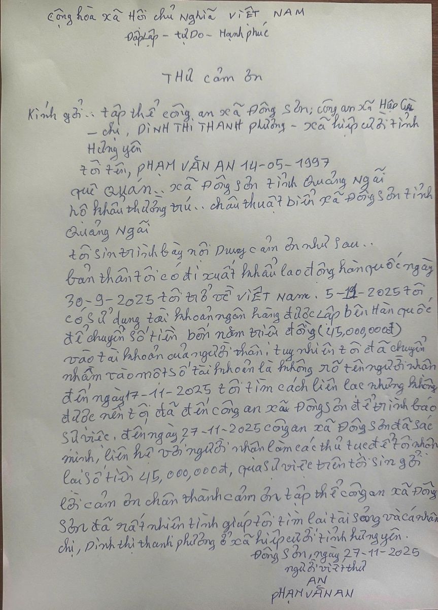 Ngày 27/11/2025, anh Phạm Văn An (1997, trú thôn Châu Thuận Biển, xã Đông Sơn, tỉnh Quảng Ngãi) đã viết thư cảm ơn lực lượng Công an sau khi được hỗ trợ nhận lại số tiền 45 triệu đồng chuyển khoản nhầm.
