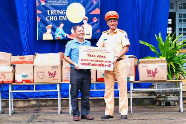 Đại diện lãnh đạo Phòng Cảnh sát giao thông, Thượng tá Dương Văn Khôi đã ân cần thăm hỏi, động viên các cháu chăm ngoan, học giỏi, đồng thời gửi tặng 60 suất bảo hiểm y tế cho các em thiếu nhi có hoàn cảnh khó khăn.
