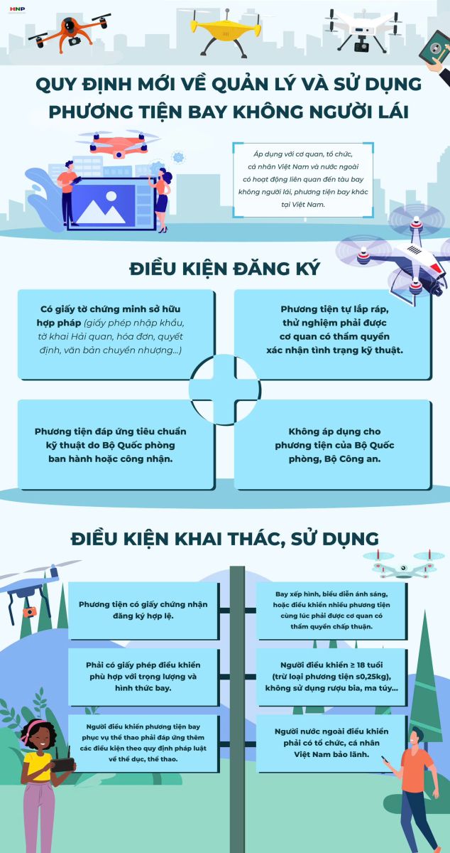 Theo Nghị định, mọi tổ chức và cá nhân sở hữu, điều khiển, nhập khẩu hoặc chế tạo thiết bị bay như máy bay không người lái, flycam, tàu lượn có động cơ, khí cầu… đều phải đăng ký phương tiện, đăng ký người điều khiển và xin phép bay trước mỗi lần hoạt động. Người điều khiển phương tiện bay phải đủ điều kiện về độ tuổi, có giấy phép phù hợp, chấp hành đầy đủ quy trình chuyên môn và không sử dụng rượu bia, chất kích thích khi điều khiển thiết bị bay.