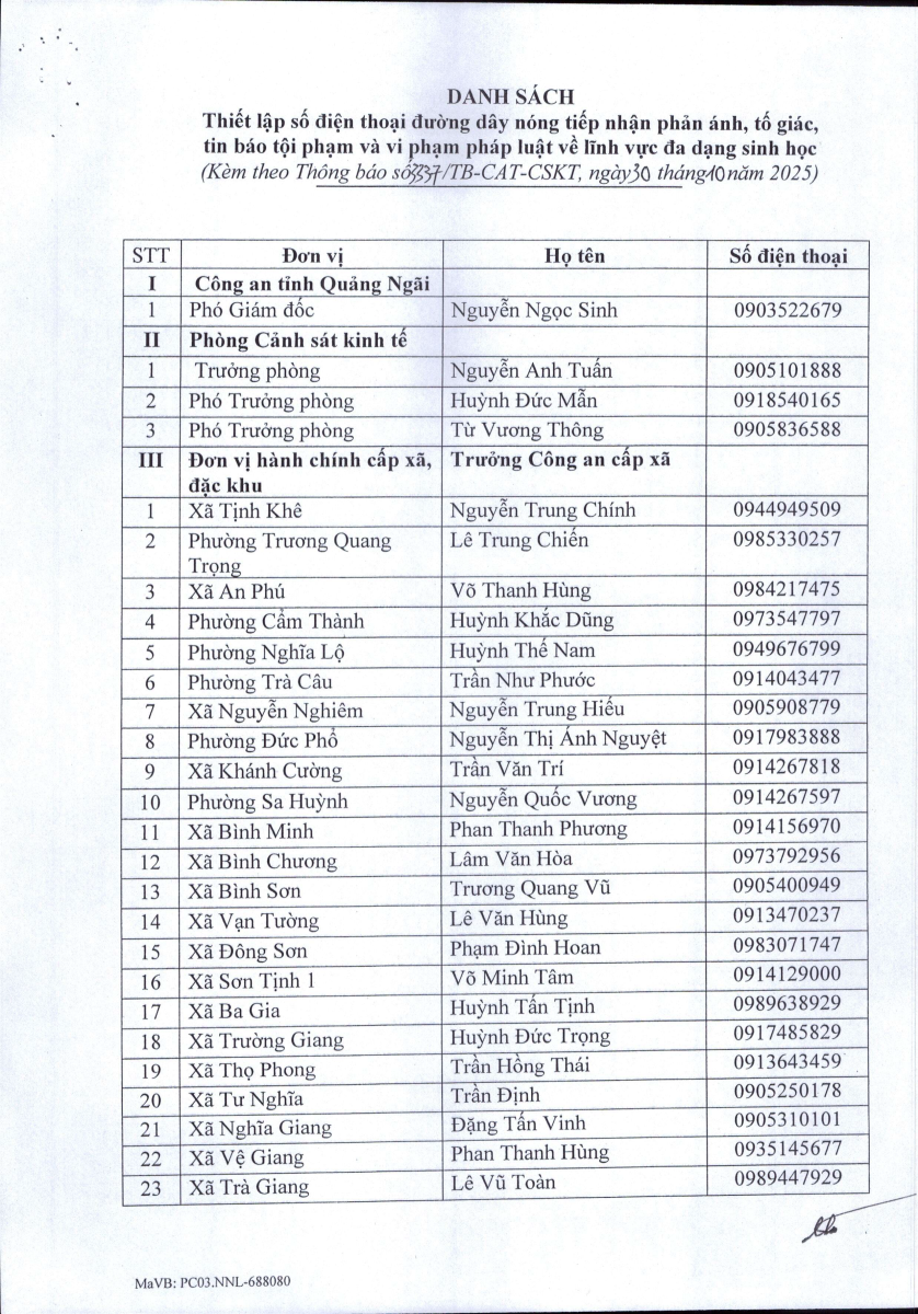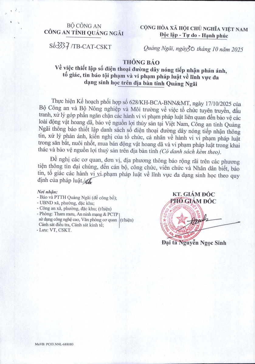 Đường dây nóng tiếp nhận thông tin, xử lý phản ánh, kiến nghị của tổ chức, cá nhân về hành vi vi phạm pháp luật trong săn bắt, nuôi nhốt, mua bán động vật hoang dã và vi phạm pháp luật trong khai thác và bảo vệ nguồn lợi thủy sản trên địa bàn tỉnh Chia sẻ: | In bài viết